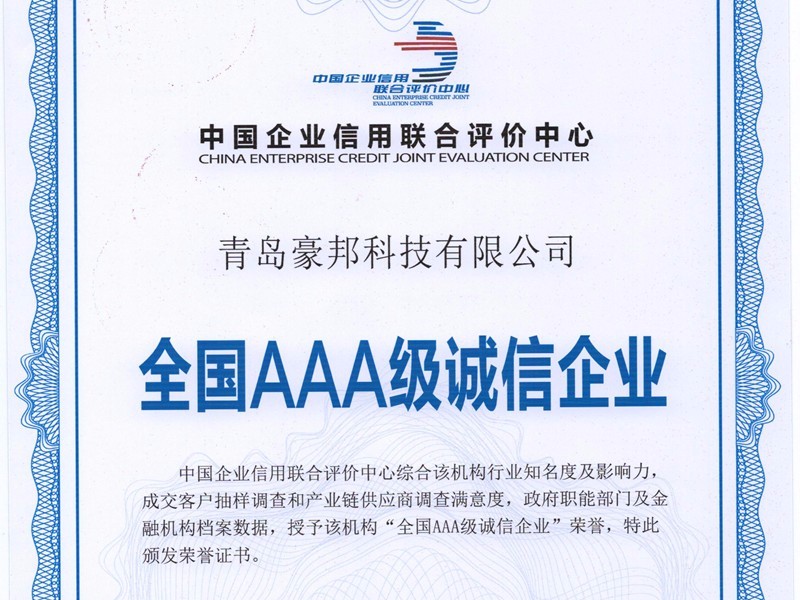 5月31日,基于豪邦科技長期以來誠信經營的發展理念,擁有了良好的誠信形象。評價中心對其信用記錄、企業素質、經營水平、外部環境、財務狀況、發展前景以及可能出現的各種風險等進行客觀、科學、公正的分析研究后,經“中國企業信用聯合中心”的綜合評定,青島豪邦科技有限公司榮獲“全國AAA級誠信企業”認證。青島豪......